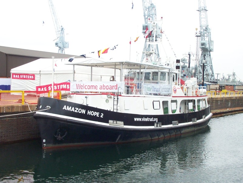 I regret lack of time prevented me from visiting any of the MCMVs open to the public before they closed their gangways but I did see former Fleet Diving Tender FDT Ixworth. She has been renamed Amazon Hope 2 by the Vine Trust (a Scottish charity) and converted into a floating medical centre for service in the Amazon.