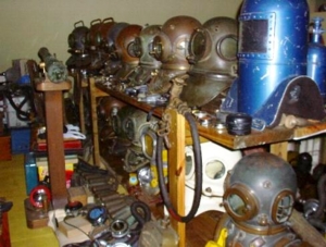 While on exchange with the US Navy, MCDOA member Paul Guiver visited Leon Lyons in Florida. Leon has what is probably the world's most extensive private collection of diving memorabilia, particularly diving helmets. Paul has sent these photos of his impressive range of artefacts plus Leon himself sporting a modest beard!