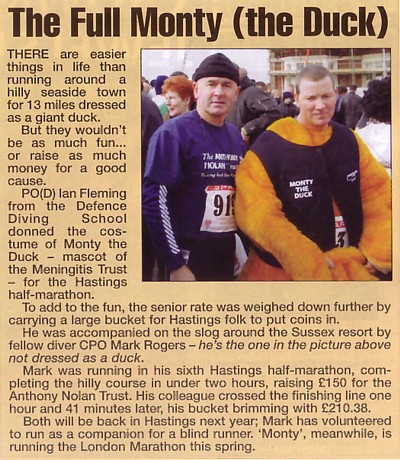 The following items from today's Portsmouth News describe an expedition to the North Pole by LS(D) John Carroll of the Defence Diving School (DDS) and the rescue of a humpback whale off Scotland by other DDS staff including MCDOA member Richard 'Soapy' Watson.