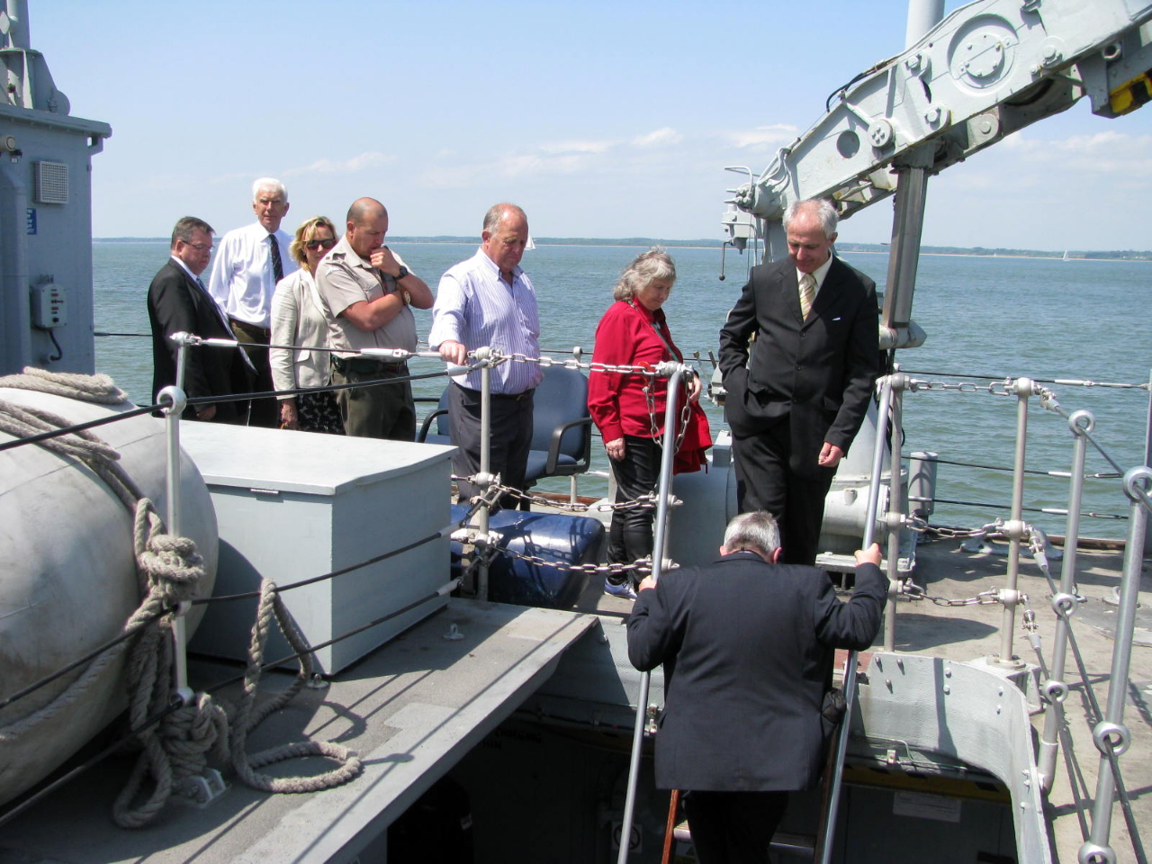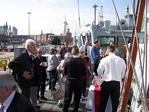 The Lord Mayor (centre) with the CO and British Ambassador on board HMS Penzance
