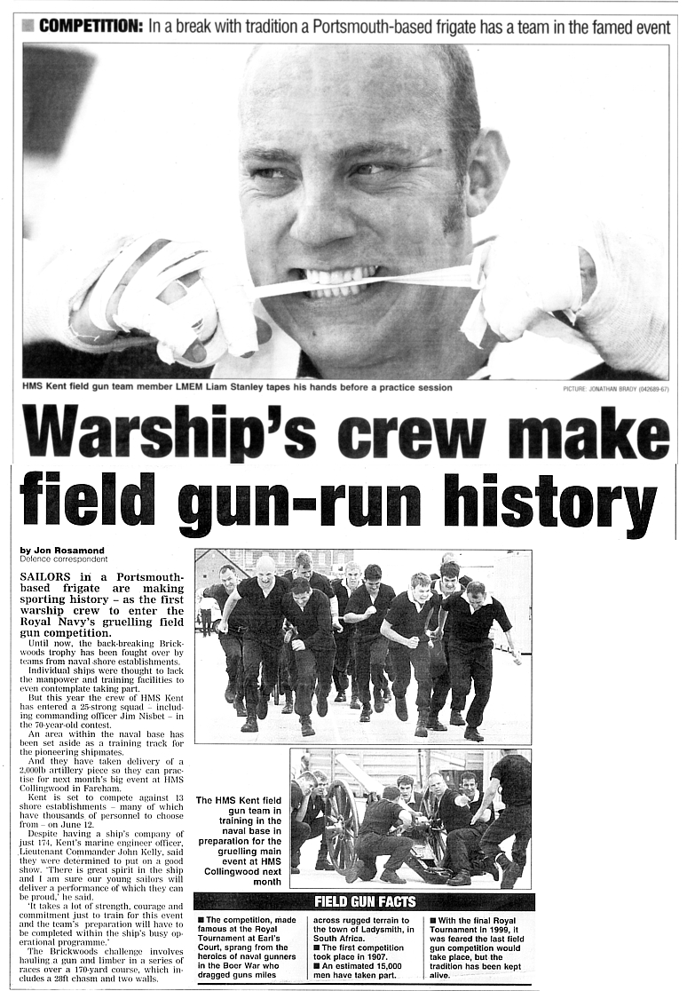 The following item from today's Portsmouth News describes the formation of a Brickwoods Challenge Field Gun team by HMS Kent and features CO Jim Nisbet in the thick of it.