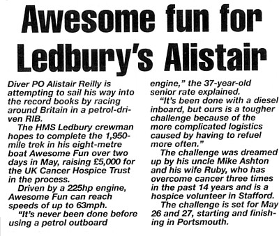 The following MCD-related items from the April issue of Navy News describe home town visits by HMS Ramsey (featuring CO and MCDOA member Tony Watt) and HMS Dulverton (featuring CO and MCDOA member Peter Laughton), a round-Britain charity RIB trip by PO(D) Alistair Reilly of HMS Ledbury and a recruitment dive by SDU1.