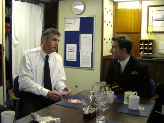 Other key MW & Diving figures on board include PO(D) Jim Craker (Coxswain), PO(MW) Jay Buckley (Boatswain), LS(D) Karl 'Ackers' Atkin (Diving Storekeeper) and LS(MW) 'Pinky' Perkins (CBM). We were then invited to lunch in the wardroom courtesy of Bob Stone-Ward (XO) and enjoyed an excellent three-course meal prepared by Ldg Chef Emmanuel Craig and served by Std 'Charlie' Drake. I was seated next to Lt Justin Magalas (OPS) on exchange from the US Navy and much enjoyed his observations.