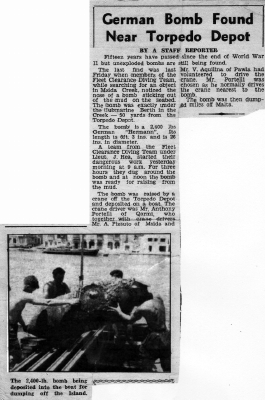Rob, I was hunting among some of my old paperwork and came across the attached photos of the German ‘Herman’ bomb that the Med Fleet Clearance Diving Team recovered from the torpedo jetty 25th May 1960. This is the bomb that we had trouble disposing of (see pages 86/87) of my scribbling's in “A Corkheads’s Chronicle”. You can clearly see the steel bars that bent under the weight of the bomb. Also depicted in the photo are Lt Jackie Rea, in his best suit minus jacket (improperly dressed), CPO Ernie Foggin CD1, L/Sea Ron Hartshorn, and ABs Chris Jones (with unlit cigarette) and Peter Power (top of head). I was the team’s photographer armed with a “Pussers” Leica Camera and therefore do not appear.